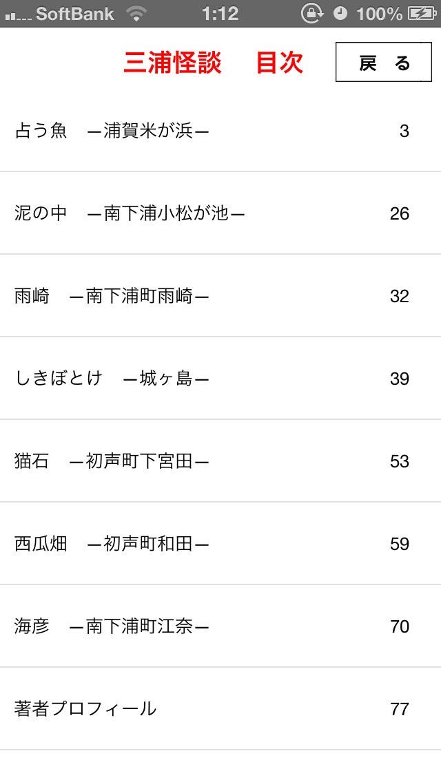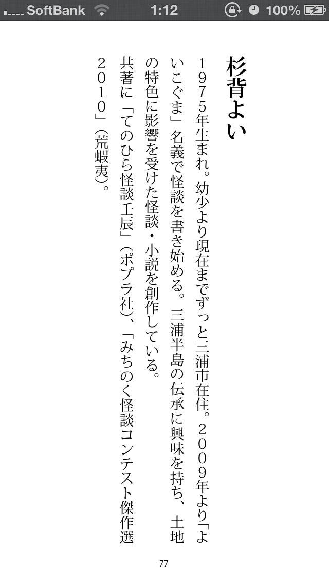 App Storeより引用三浦半島の伝承を元に、土地の特色に影響を受けた怪談・小説を創作している作家「杉背よい」の短編集。浦賀、小松が池、雨崎など実在の土地に伝わる伝承が小説のアイデアとなっています。