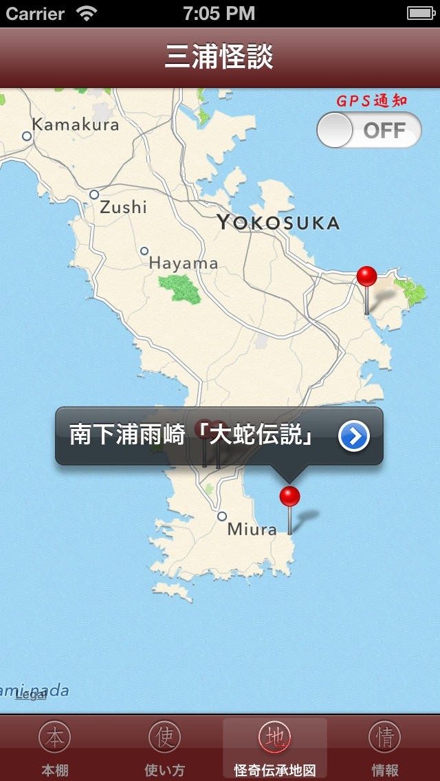 アプリには小説の元になった伝承を紹介する「怪奇伝承地図」も搭載しています。GPSをONにして三浦半島の怪奇伝承ポイントに近づくと、ローカル通知によりお知らせいたします。