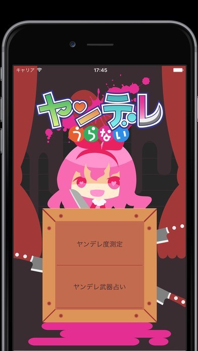 自分がヤンデレなのか気になる方や、カップルでお互いのヤンデレ度を診断してみたい方には、『ヤンデレ占い』が役立ってくれます。2種類のモードを搭載しており、ヤンデレ度測定では質問に答えることで心の奥底に潜むヤンデレ度合いをパーセント表示。どんなタイプのヤンデレなのかも教えてくれるため、彼氏や彼女、友達と一緒に占えば、お互いの意外な姿を知ることができるでしょう。ヤンデレ武器占いではデフォルメ調のかわいいイラストで、ヤンデレ武器を表現しています。日本刀や鉤爪、さらには手錠に五寸釘などが登場。ちょっとした暇つぶしとして、自分や恋人のタイプに合ったヤンデレ武器を探してみてはいかがでしょうか。