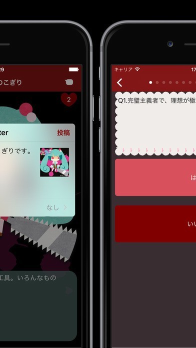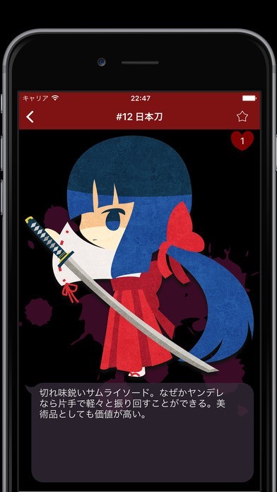 用意されている質問に答えることで、自分にどれぐらいのヤンデレ度があるかを診断してくれるアプリです。ヤンデレ度はパーセントで表されて、嫉妬タイプなどヤンデレのタイプも分かります。 占いの結果によって怖いながらもかわいいヤンデレなキャラクターや武器が登場します。出現したキャラクターは図鑑に登録され、全部で123人いるので集めがいがあります。 自分を占うだけでなく恋人や気になる異性のヤンデレ度を知ることで、対応の仕方を学ぶこともできます。