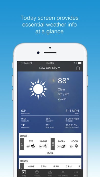 世界中の天気をスタイリッシュなデザインで知ることができるアプリです。トップ画面にはアプリを開いた時にいる場所の天気がアニメーションとともに表示されるので、パッと見ただけで天気がわかります。気温や降水確率はもちろん、1時間おきの天気予測や週間予報、空気のクリア度や日の出、日の入りの時間など、このアプリひとつで天気に関わる様々な情報を確認することができます。