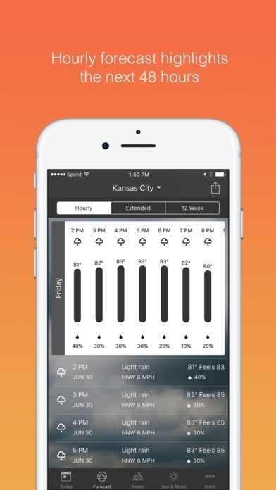 現在の天気に応じた背景のグラフィックや、降水確率をビーカー内に色をつけて表示したり、最高気温と最低気温を温度計のように表示したりと、天気に関する情報が視覚的に入ってくるデザインが特徴です。ちょっと変わった天気予報やおしゃれな天気予報を求める人に最適です。