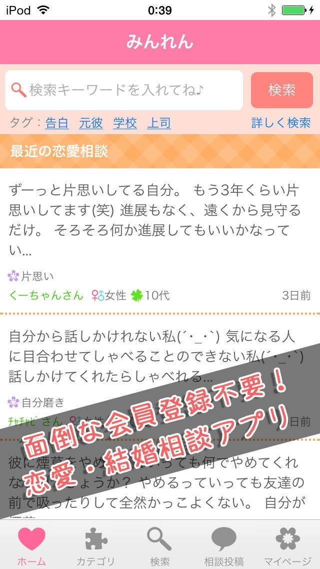 メールアドレス登録不要ですぐにアプリを使えます!あなたの恋バナや悩み等あれば是非投稿してみてください!何か役に立つコメントをみんれんのユーザーからもらえるかもしれません!