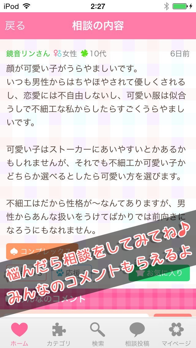 ⇒投稿された相談にはコメントをすることができます!男性や女性に対する質問や、デートに関する質問等色々な相談がユーザーから寄せられますので、参考になるコメントをしてみてください!!