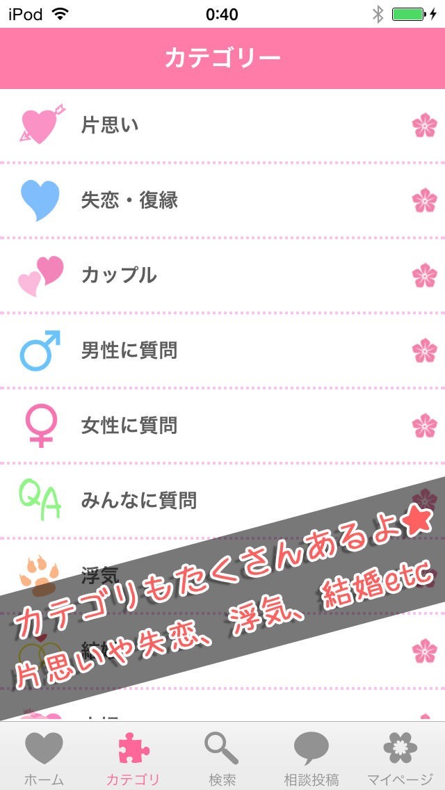 ⇒恋愛や結婚等の相談を投稿することができます!片思いや失恋、カップルの悩みや浮気、結婚や不倫、離婚、さらには恋愛心理やコンプレックス、LGBTの悩み等を相談できますので、投稿して他のユーザーからコメントを貰いましょう!
