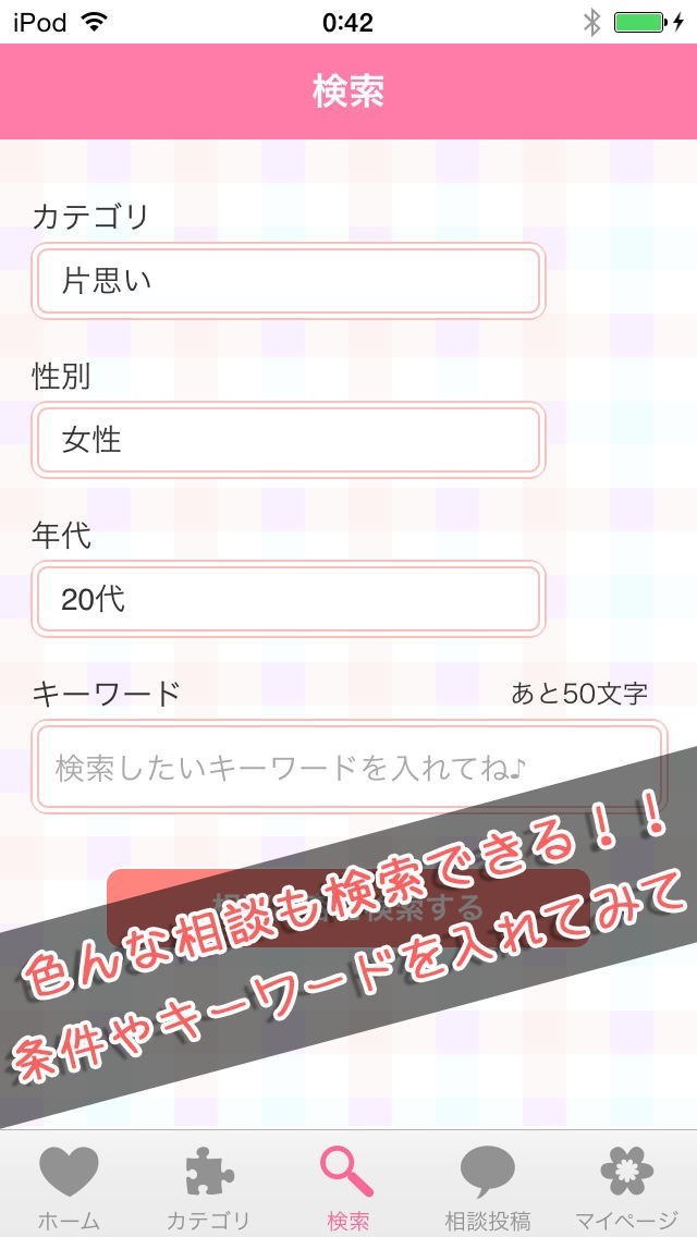 ユーザーが登録した相談を、あなたの気になったキーワードで調べることができます!"学校"や"年上"等で検索してみましょう!また、キーワード以外では、性別や年代、カテゴリーで調べることもできます!