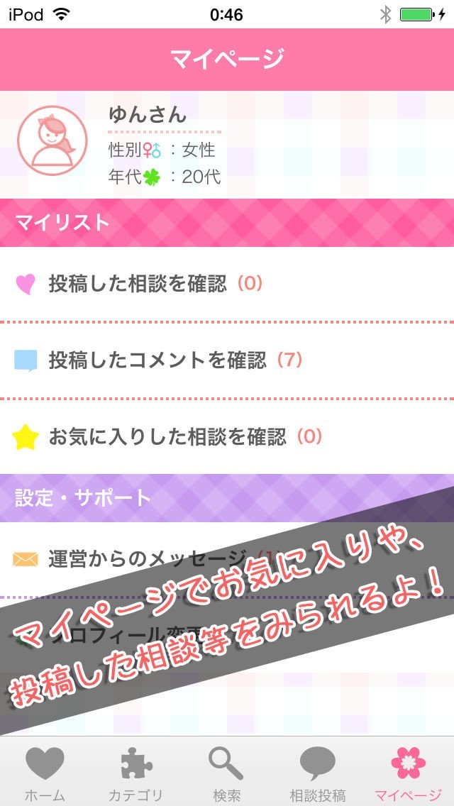 マイページでは、あなたの投稿した相談や、コメント、登録したお気に入りや、運営からのメッセージを確認することができます。プロフィールの変更もこちらで行えますので、変更したい際はここで行いましょう!