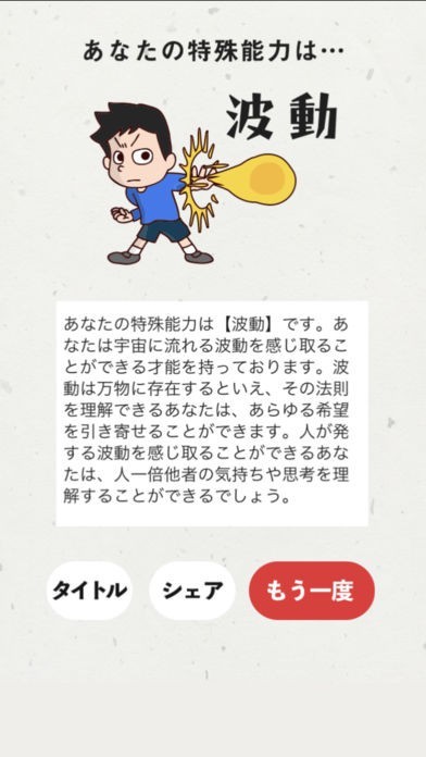 4択の質問に答えていくだけで診断結果が見れるので、どんな特殊能力を持っているのかわかって面白かったです。