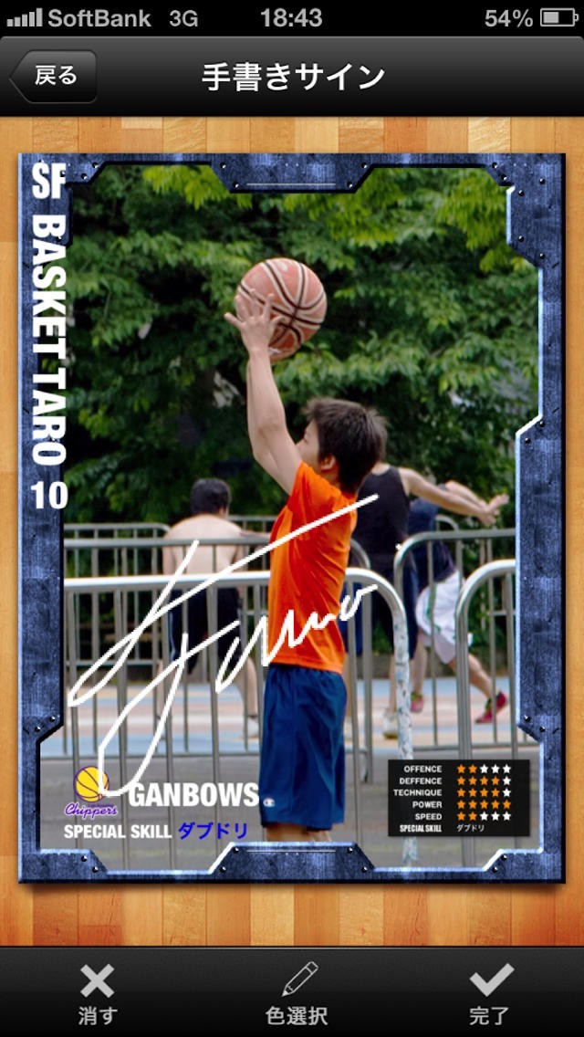 指でスマホをなぞることで自分のサインを書くことができ、そのサインをカードに添えることができるので、より本格的なプロのバスケットボール選手気分を味わうことができる。