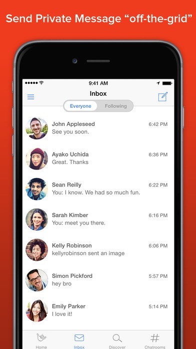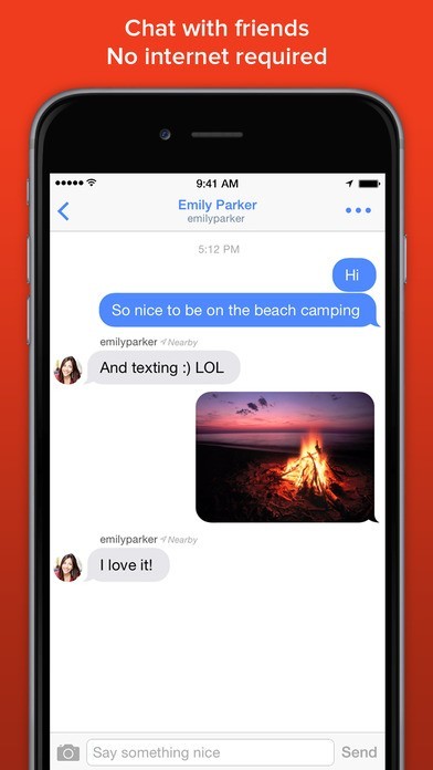 「FireChat」はインターネットが接続できない状況や、通話のための電波がない状況でも使用することができるインスタントメッセンジャーアプリです。このアプリでBluetooth通信やWi-Fi通信を利用することで自分から約70メートル以内にいるユーザーとやり取りをすることが可能となっているので、インターネット回線等が使えない状況でもメッセージのやり取りをすることができます。メッセージはエンドツーエンドで暗号化されているので、他のユーザーに見られることはなく安心して利用することが出来るほか、メッセージにハッシュタグをつければすぐにチャットルームを作成可能です。