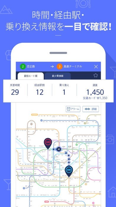 「韓国地下鉄」は日本語や英語、中国語に対応した韓国地下鉄路線図検索アプリです。ソウルや釜山など人気観光地の路線図を網羅しておりカラーの路線図で出発駅や到着駅、経由駅、乗り換え、運賃などを一目で確認できます。乗り過ごし防止のアラーム機能や駅近くの観光スポットランキングがチェックできる機能など様々な機能が搭載されています。