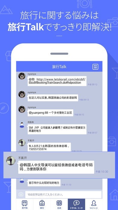 利用した地下鉄の経路を記録することであなただけの旅行マップが作成できます。「旅行Talk」機能を使えば他の旅行者と意見交換ができ、旅行情報を共有することでより韓国旅行を楽しめます。