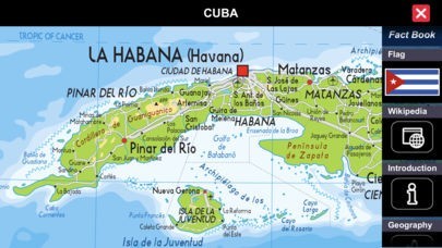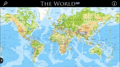 The interface is animated and interactive. Touch a country on the world map and the Retina vector country map opens while the factbook slides onto the screen, each topic neatly organized as tiles along the edge of the map. Touch a factbook tile and it zooms out to reveal detailed information about that topic. Not sure where a country is located? Select it on the drop-down list and The World HD zooms in on it then opens the map and factbook.
