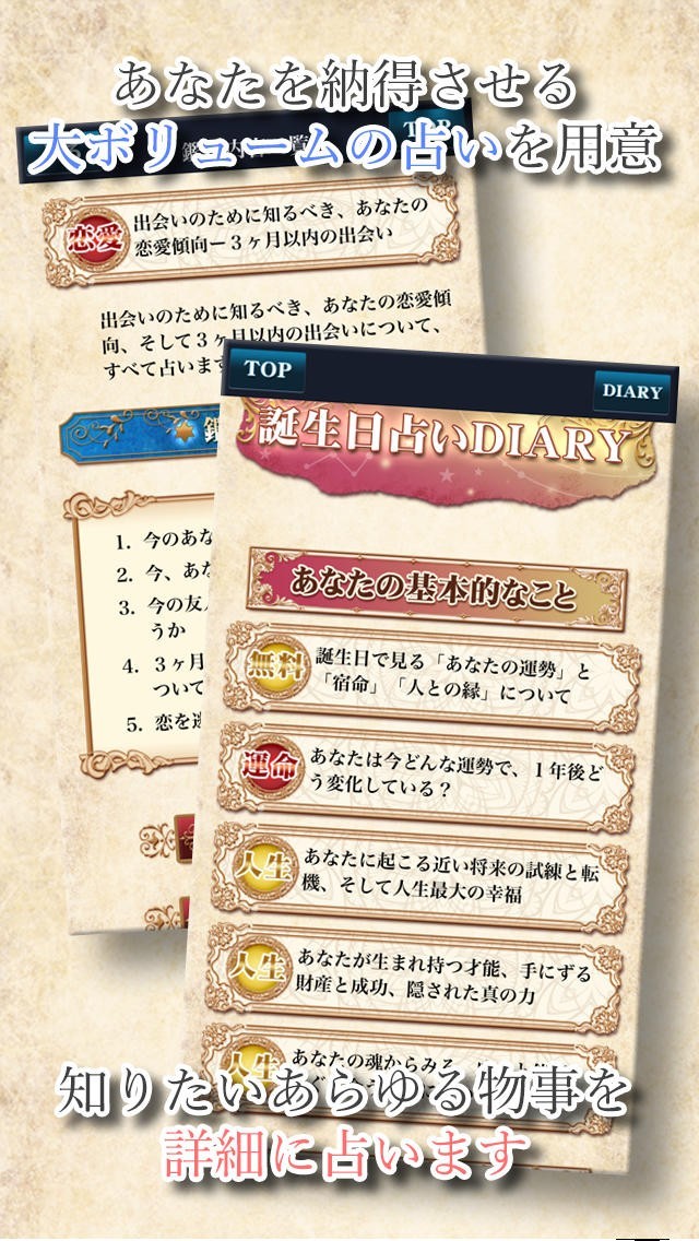 ・充実の占いメニュー。大ボリュームの診断結果と、豊富な診断内容を用意しました。