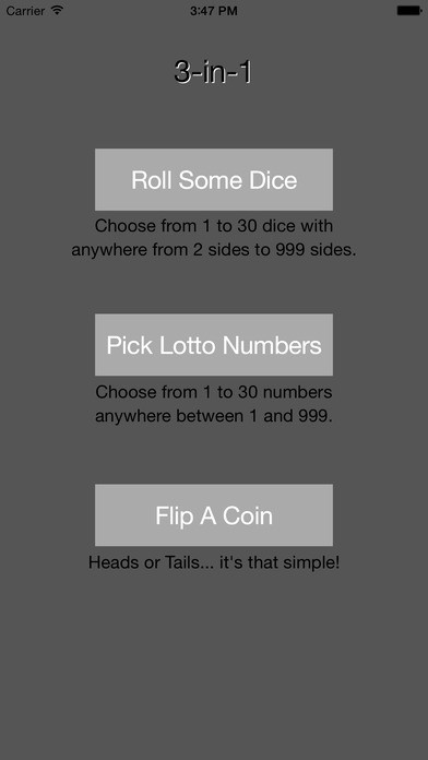 3 utilities in 1 for your Apple Watch and your iPhone. You can roll some dice, pick your favorite lotto numbers or simply flip a coin. Dice roller lets you pick between 1 and 36 dice with 2 to 999 sides per dice. Lotto picker lets you choose from between 1 and 36 numbers with a range from 1 to up 999. And if you simply need to flip a coin, there is a quick utility to choose Heads or Tails for you. Optimized for you Apple Watch, Apple Watch Sport and Apple Watch Edition as well as for your iPhone 5, iPhone 6, iPhone 6 Plus, iPad and iPad Mini. It can handle both single dice rolls and multiple dice rolls up to 36 dice at a time. It can accomodate from 2 sides up to 999 sides on each dice. On your Watch you can choose up to 9 dice at a time with up to 99 sides on each dice. For lottery picks you can choose from 1 pick to 36 picks and choose the range from 1 to up to 999. On your Watch you can choose up to 9 numbers at a time with a range from 1 up to 99. Can not make up your mind about something? Then flipping a coin is the answer! Both iPhone and Apple Watch versions have a simple FLIP button that will decide for you!
