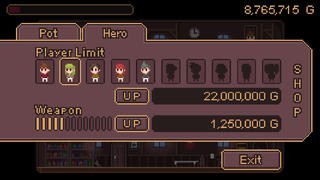 壺を割って貯めたお金で「Weapon」能力をアップすると武器が木の棒から様々な剣に変更ができ、「Player Limit」をアップするとキャラクターも変更が可能になります。女の子のヒーローも出現し、仲間を増やすと壺を割る速度が何倍にもなります。