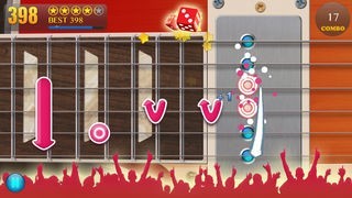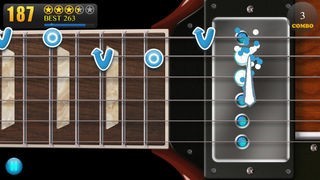 画面に表示されたギターフレットをタップすることで音が鳴り、スワイプすることでチョーキング演奏ができます。正しく演奏するとコンボとなり得点が加算されていく仕組みとなっています。