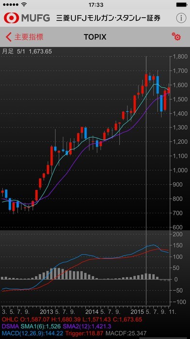 国内取引所の株価に加え主要指数のチャートとテクニカル指標で分析も可能!!