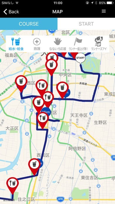大阪マラソンのコース、スタート位置周辺情報が確認できます。