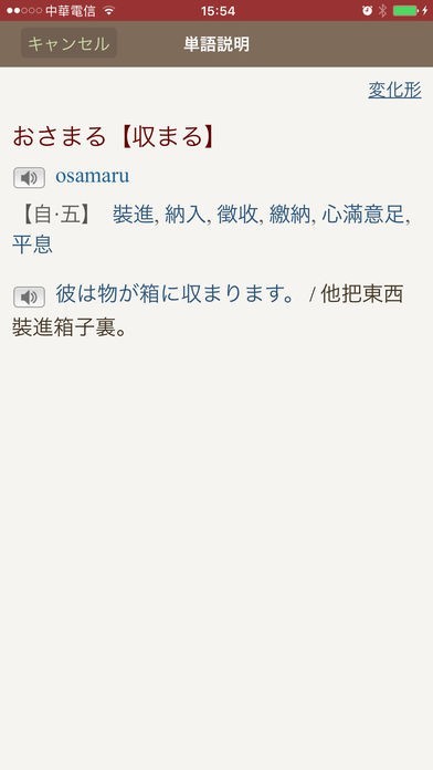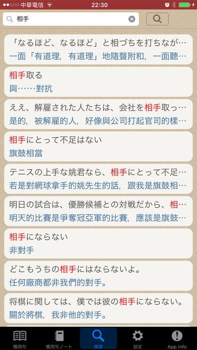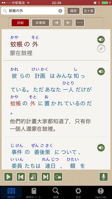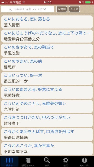 * 日/中のキーワードで慣用句を検索することができます。素早く適用な慣用句を見つけ出す。