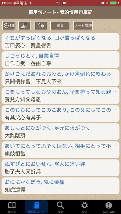 * 参考や覚えたい慣用句を慣用句ノートに記録することができます。ノートの内容はいつでも編集・閲覧が可能です。