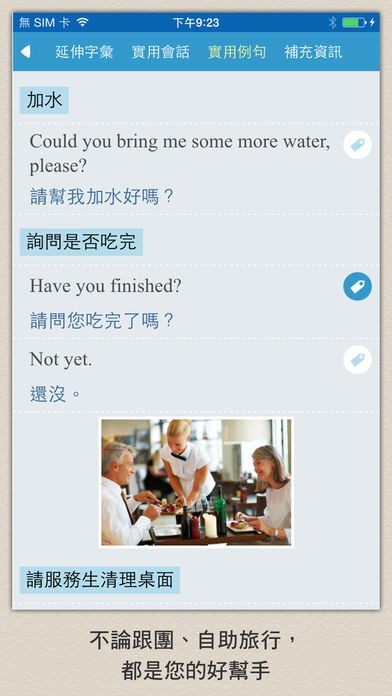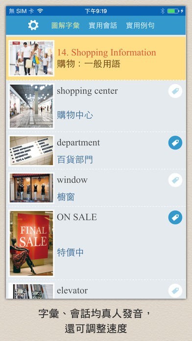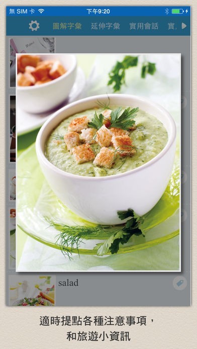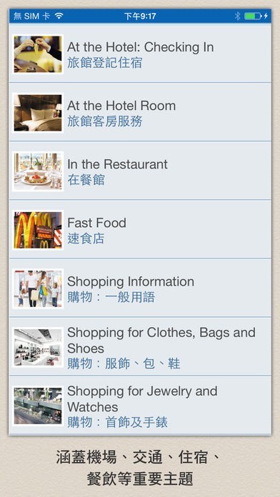 App Storeより引用目不暇給的彩圖,搭配實用單字與會話,讓你還沒出國就先認得各種異域事物「長相」,不用再慌忙翻閱旅遊英文書!「百聞不如一見」,這句話不是沒有道理的。本 app 創新採用大量實景照片來介紹字彙和會話,以視覺輔助記憶,不僅學來輕鬆,印象也特別深刻。