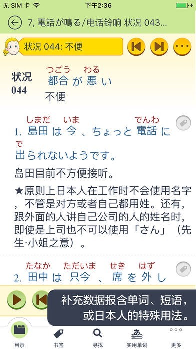 依不同的句子补充各类实用相关资料,包含单词、短语,或是日本人的特殊用法。