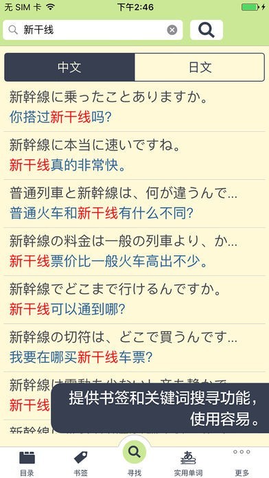 可以用中文或日文关键字寻找相关的句子,快速找到合用的句子。