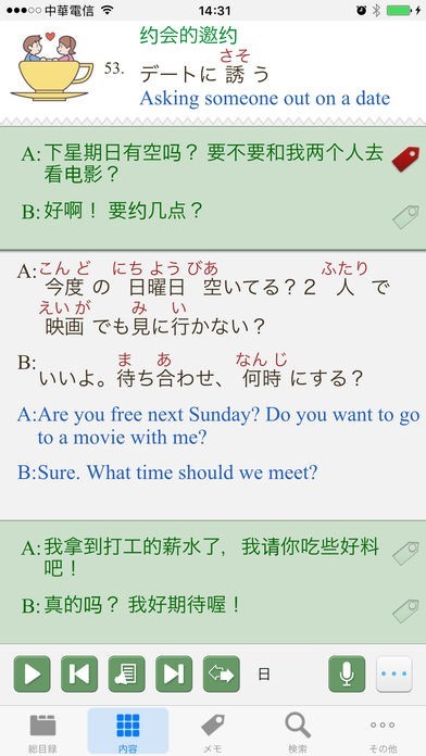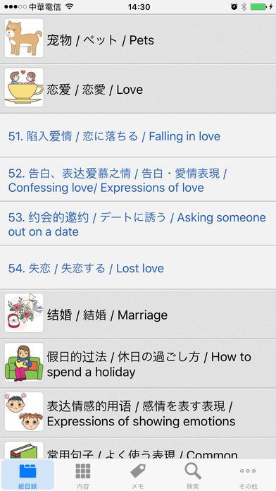 例えば街で道に迷ってしまった時、気になるあの人を食事に誘いたい時、自分の星座を伝えたい時、自分の趣味を伝えたい時、日中英‧日常会話辞書は活躍します。「食事」と日本語で検索をすれば、「食事」に関連する会話が出てきます。これで、予習はバッチリです。