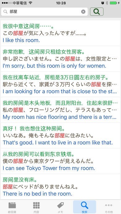 このアプリでは、日本語、中国語、英語の3つの言語について会話表現を手軽に検索することができるので、特定のワードを含んだ会話表現を調べて、会話の練習をすることができます。