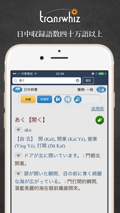 「Transwhiz 日中(繁体字)翻訳/辞書 v4」は翻訳と辞書の両方を兼ね備えた画期的なアプリです。収録用語は一般的に使われる単語から、各種専門用語まで幅広く入っています。