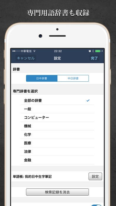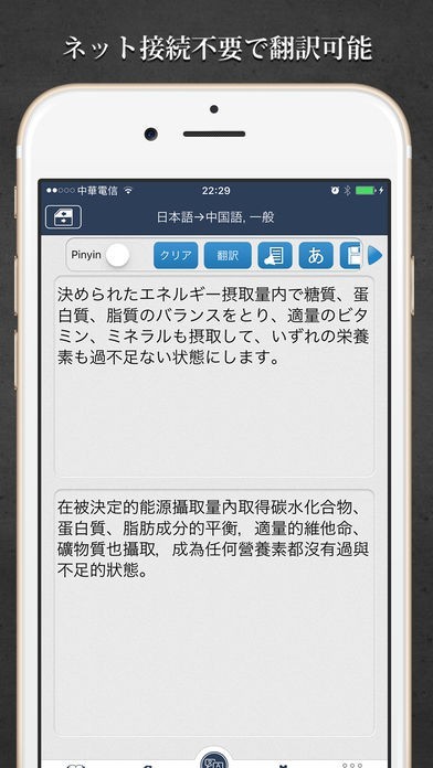 日本語から中国語へと、中国語から日本語への、それぞれの翻訳機能が備わっていて、スマホに入ってるだけで即座に意味や言葉を調べられます!