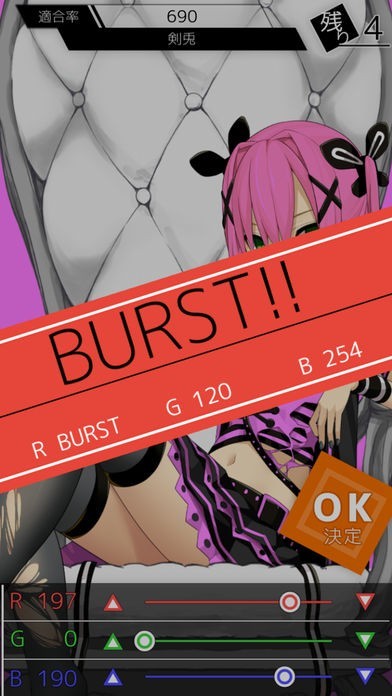 色を選び終わった後に少女達との適合率を判定してもらえます。3種類の色をそれぞれ0~200以上まで選ぶことが可能なので組み合わせパターンが数えきれないくらい用意されています。