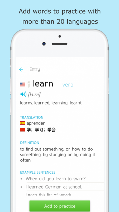 - The ability to add as many words as you like from the dictionaries to your personal practice list (you can only add up to 20 words in the free version)
