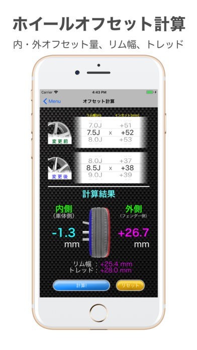 タイヤ交換時に、ホイールのオフセットを計算するとリム位置変化量がわかります。mmとinchの単位を選びます。数字の入力で、リム幅やトレッドの変化量が簡単に出せ、参考になります。