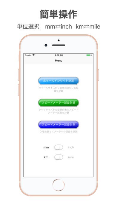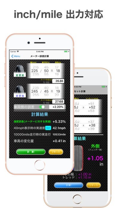 車両タイプによって誤差補正の状況を変えることができるのが、「TireCalculator オフセット&メーター誤差計算」の魅力です。kmだけではなく、inchやmileに対応しているため様々な数値で補正を確認できます。