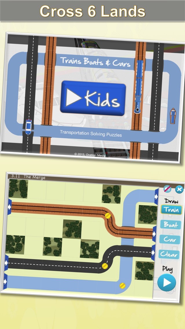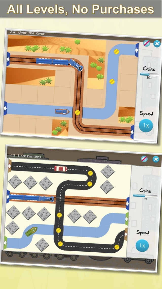 App Storeより引用Kids version of the popular Trains Boats & Cars. Easy levels to keep the kids thinking. Touch and drag the tracks, waterways, and roads to complete the puzzle, then watch it play and avoid collisions.