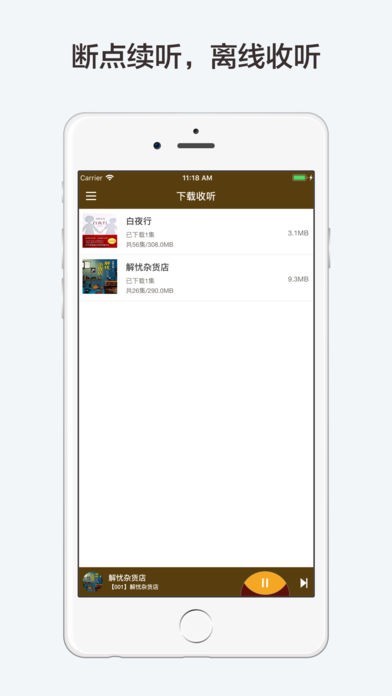 3. 离线收听。可以在有WIFI的环境下先下载再收听,在没有网络或者网络不好时,也可以方便的收听【东野圭吾作品集】的全部剧集,打发无聊时光。