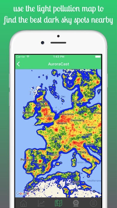 The integrated Light Pollution Map helps you find the darkest places near you for the best viewing of the aurora borealis, and the night sky. Our light pollution map has global coverage and is the most detailed and accurate light pollution map available. Or before you even step outside, you will know if the aurora will even be visible at all and not obscured by heavy cloud coverage with the cloud cover map!