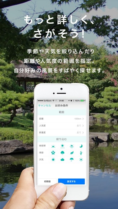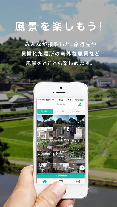 「Paddy」では風景写真を探すことができます。 まずは現在位置、指定位置のどちらか選んで探します。 範囲や季節など条件の指定ができるため、目的に合った風景写真を探しやすくなっています。 カメラで風景写真を撮影したいけど、撮影スポットが分からないという時にも便利です。 良い風景写真が見つかったら、星印を付けて評価することも可能です。 自分で撮影した風景写真も登録できるため、他のユーザーにこんな風景が見られる、撮影できると知らせたい時にも使えます。 良い風景写真が撮れたので、他のユーザーから星印が付くかどうか試してみたい時にも役立ちます。