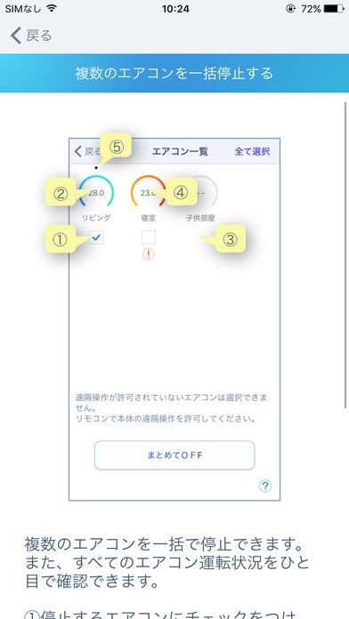 あらかじめ対象となるエアコンを複数登録しておくことによって、まとめてエアコンを停止することが出来るようになっているほか、個別のエアコンを選択して停止することも可能です。