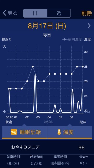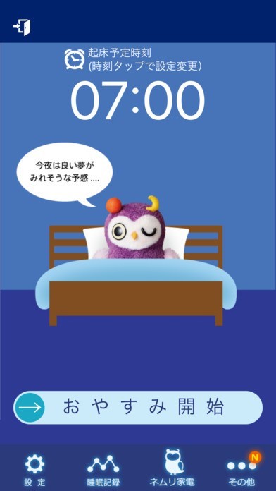 「おやすみナビ」は明日早くから仕事なのに中々眠れないというビジネスマンの方に便利なパナソニックのアプリです。 寝返りは血行不良を防ぐ働き、布団内の温度が高くなり過ぎないよう調節する働きがあると考えられています。 暑くて寝苦しい夜は寝返りの回数が多くなる傾向があるのです。 このアプリには就寝中の体動を検知し、エアコン温度の自動調整を行う機能が付いています。 おやすみスコアにて快適な睡眠ができたかどうか、分かりやすくなっています。 無音だと車や時計の音が気になって眠れないという時はお休みミュージックを流しておくという使い方ができます。 就寝時刻、起床時刻、睡眠時間なども表示させる事も可能です。