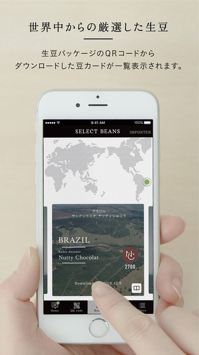 お客様に届けられる生豆パック記載のQRコードを読み込むと、「豆カード」のダウンロードができます。