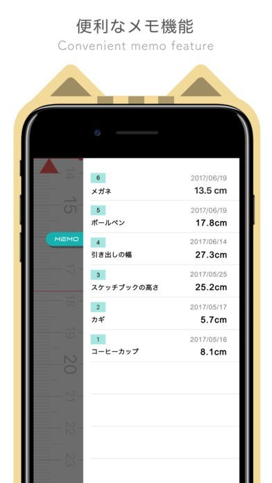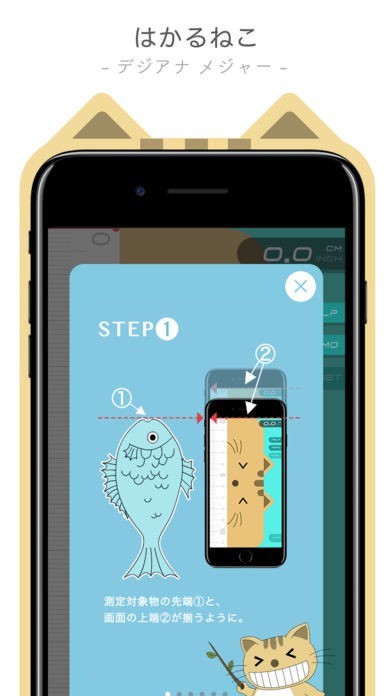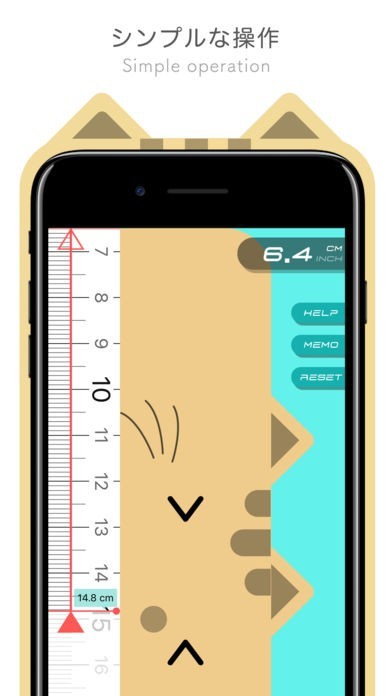 ペットとしても愛されるネコちゃんが、定規となって、ユーザーのことを手助けしてくれます。ガイドにあわせて、測りたいものの上から下まで合わせていくと、長さが測れます。