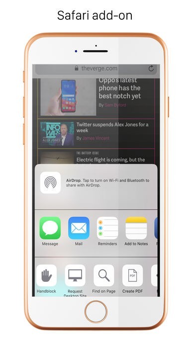 Handblock is blocking ads, content, tracking url's and cookies from Safari and increases up to 5X browsing speed and 22% of battery life on your device.