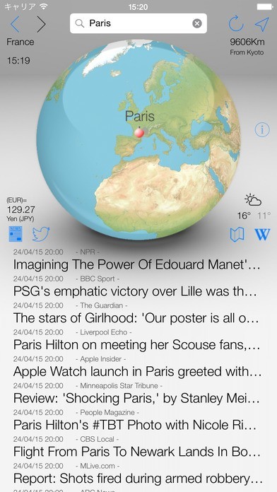 このアプリの特徴は、地球儀を回して好きな所をタップすると、その地域の関連する情報が見ることが出来ます。ちょっと、遊び心の効いたアプリです。経済情報も出るので株式相場をされている方にも重宝しそうです。最近は為替の変動に相場が大きく動いたりしますので、チェックは欠かせません。また、海外での日本の国際試合の情報も見ることが出来るのでいいですね。また、日本のライバルの情報などもチェック出来ます。サッカーファンにはWカップの試合情報も手に入りやすいと思います。