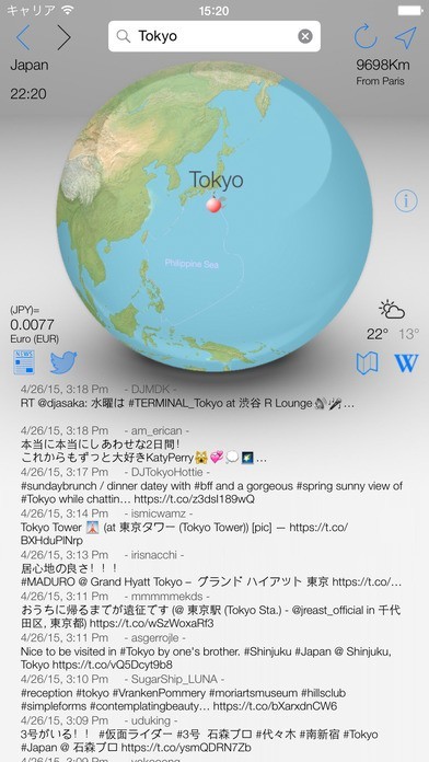 手の中に世界を。その名の通りスマホが世界地図になってしまったかのようなアプリ。画面上の世界地図をスワイプして世界地図を確認するだけではなく、現地時間やローカルニュース、wikipedia、ジオローカライズされたつぶやきもタップ一つで読むことができます。今テレビで特集している国はどのあたりでどんな歴史があるのだろう‥。そんな小さな興味から様々な知識を手に入れることができます。