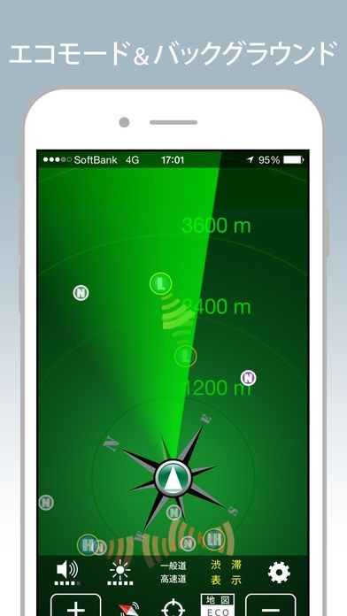 運転中は常に起動している本アプリでは、iPhoneのバッテリーを過剰に消費してしまうことがないようにエコモードが用意されています。また、アプリを起動していなくてもオービスの検索が行っています。