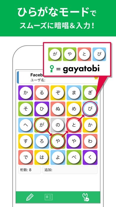 「PassClip」では、パスワードを管理することができるので、同じパスワードを使いまわしているような方にとって特に役立ちます。 パスワードは直接的に表示されるわけではなく、25マスのどこかの4マスの組み合わせによって表示されるので、そのパターンを覚えておくことによって、パスワード自体は忘れてしまったとしても問題ありません。 さらには、「ひらがなモード」では、英文字をひらがなに変換して表示されるので、より他者には理解できないようにすることができます。 加えて、セキュリティも256bit AESという強固な暗号化がされていることから安心して利用することができます。