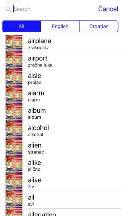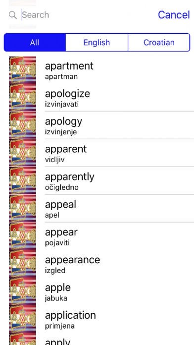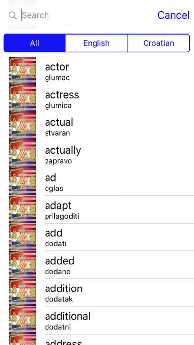アプリの辞書で「ALL」を選択すると、英語とクロアチア語を一度にチェックすることができます。色んな単語について、上に英語、下にクロアチア語が並んで表記されています。画面の切り替えなしで変換結果をチェックすることができます。